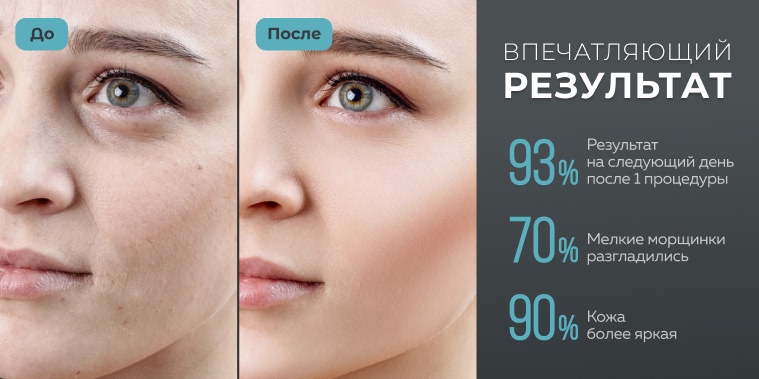 Даже после первого сеанса на следующий день наблюдаются видимые результаты, после нескольких применений кожа подтягивается, становится увлажнённой, упругой и сияющей.