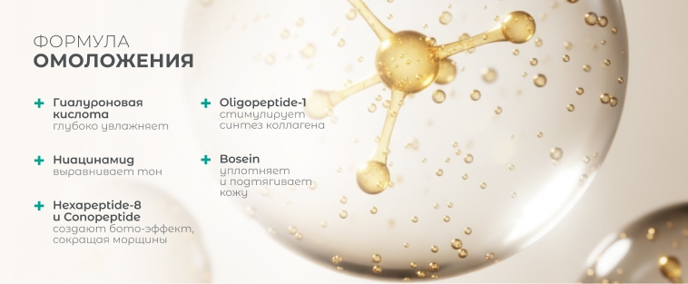 - Олигопептид-1 стимулирует выработку собственного коллагена, эластина и гиалуроновой кислоты. Делает кожу более плотной, упругой и гладкой. Уменьшает видимость морщин. Придает коже здоровый свежий вид.