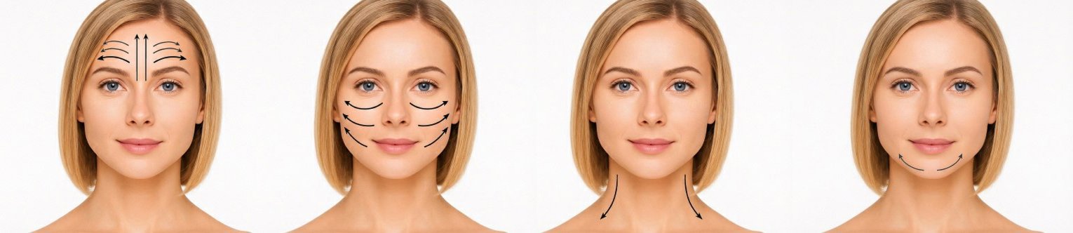 - Шея: по боковым поверхностям снизу-вверх и сверху-вниз (избегая области щитовидной железы — центр шеи).