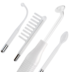 Насадки: гребень, грибок и капля заполнены специальной газовой смесью, которая обуславливает фиолетовое свечение во время процедуры. Данная смесь обладает выраженными антибактериальными и противовоспалительными свойствами по сравнению с другими вариантами. Наиболее часто «фиолетовые» электроды применяются в профессиональном оборудовании для Дарсонвализации.