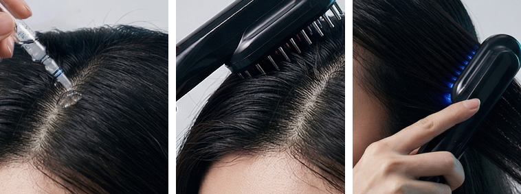 Перед началом процедуры снимите защитную пробку и аккуратно заполните специальный отсек ампулой или сывороткой. Нанесите небольшое количество средства на проблемные зоны кожи головы, где нужно усилить рост волос.