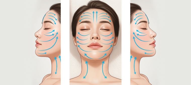 Шея: для лифтинга снизу вверх — от ключиц к углу нижней челюсти, для дренажа - сверху вниз, от угла нижней челюсти к ключице, избегая области щитовидной железы.