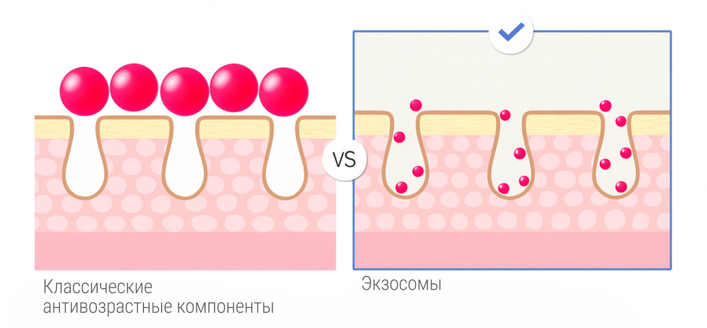 Косметика с экзосомами превосходит по эффективности другие виды средств, так как действует на глубинном уровне, изнутри, более мощно и быстро. Это не просто увлажнение или поддержание защитной функции, а настоящее перепрограммирование кожи на работу в молодом и здоровом режиме.