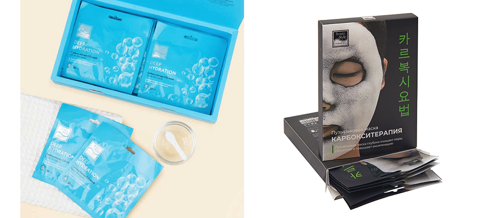 - Маска увлажняющая Carboxy therapy CO2 — Deep hydration — двухфазный продукт, состоящий из порошка и геля активатора. При смешивании порошка и геля выделяется диоксид углерода, который легко проникает в кожу, улучшает кровообращение и насыщение клеток кислородом. Восстановительные процессы начинают протекать гораздо быстрее, ускоряется выработка коллагена, выводятся токсичные продукты из клеток. Кожа начинает сиять, улучшается ее цвет и тон, повышается упругость. В наборе 10 саше, чего вполне достаточно на курс. Карбоксимаска прекрасно подходит для любого типа кожи, сочетается с уходовыми программами, аппаратными методиками, массажами лица.