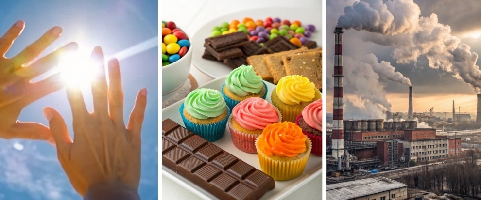 - Плохая экология. Загрязненный воздух вызывает окислительный стресс в кожном покрове, приводит к накоплению токсинов, разрушает коллаген и кератин, способствует раннему появлению возрастных пигментных пятен.