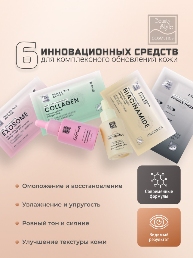 Встречайте новую серию EXOSOMES от Beauty Style — современный уход, созданный для омоложения, восстановления и улучшения качества кожи. Формулы основаны на биотехнологичных активах: экзосомах, PDRN, коллагене, гиалуроновой кислоте, витамине C и ниацинамиде, которые помогают коже выглядеть более плотной, гладкой и ухоженной уже после первых применений.